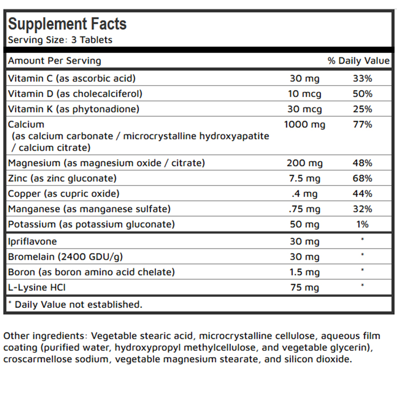 A synergistic blend of Calcium (from multiple bioavailable sources), Vitamin D3, Vitamin K, and Magnesium supports the development and maintenance of strong, healthy bones.