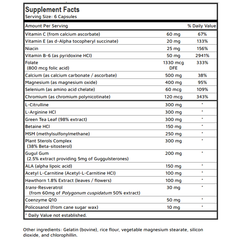L-Citrulline, L-Arginine, Hawthorn, Coenzyme Q10, and Plant Sterols help improve blood flow, heart function, and cholesterol balance.