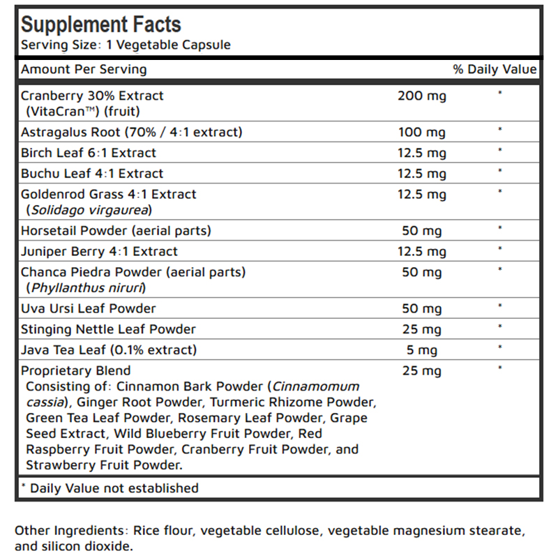 Supports urinary health with Cranberry and Uva Ursi, while Buchu, Goldenrod, and Birch help promote healthy bladder function and urine flow.
